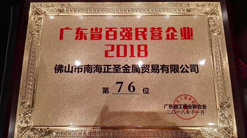 2018年11月20日,全省民營企業學習貫徹習總書記重要講話精神大會暨“萬企幫萬村”工作推進會在廣州召開。廣東省工商業聯合會(總商會)在會上發布“2018廣東省百強民營企業”榜單。佛山市南海正圣金屬貿易有限公司以125.75億營收光榮入榜,位列第76名。