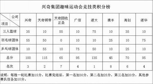 興奇集團(tuán)首屆趣味運(yùn)動(dòng)會(huì)隨著籃球比賽結(jié)束的一聲哨響圓滿結(jié)束。湛大隊(duì)以135分總分榮登積分榜榜首,天奇銅帶以115分總分緊跟其后,位居第二。總部興奇隊(duì)以100分總分列居第三。