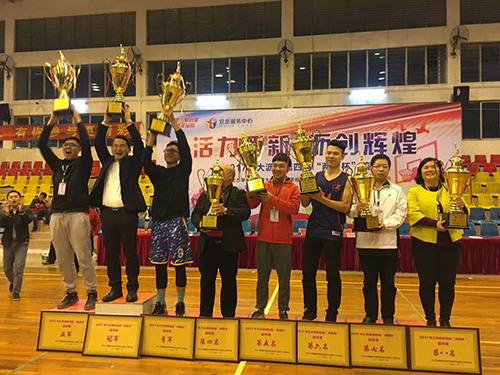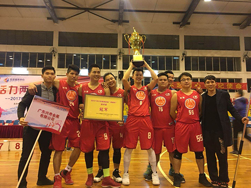 (圖為2017年大瀝鎮(zhèn)第四屆“兩新杯”籃球賽獲獎(jiǎng)隊(duì)伍合影,左二為興奇黨支部籃球隊(duì)代表陳賀枝)