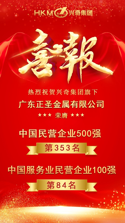 2023年9月12日上午 ,2023中國民營企業500強峰會在濟南開幕。會上,全國工商聯發布《2023中國民營企業500強調研分析報告》。興奇集團旗下廣東正圣金屬有限公司(下稱“正圣金屬”)榮膺“2023中國民營企業500強”榜單第353位、“2023中國服務業民營企業100強”榜單第84位。